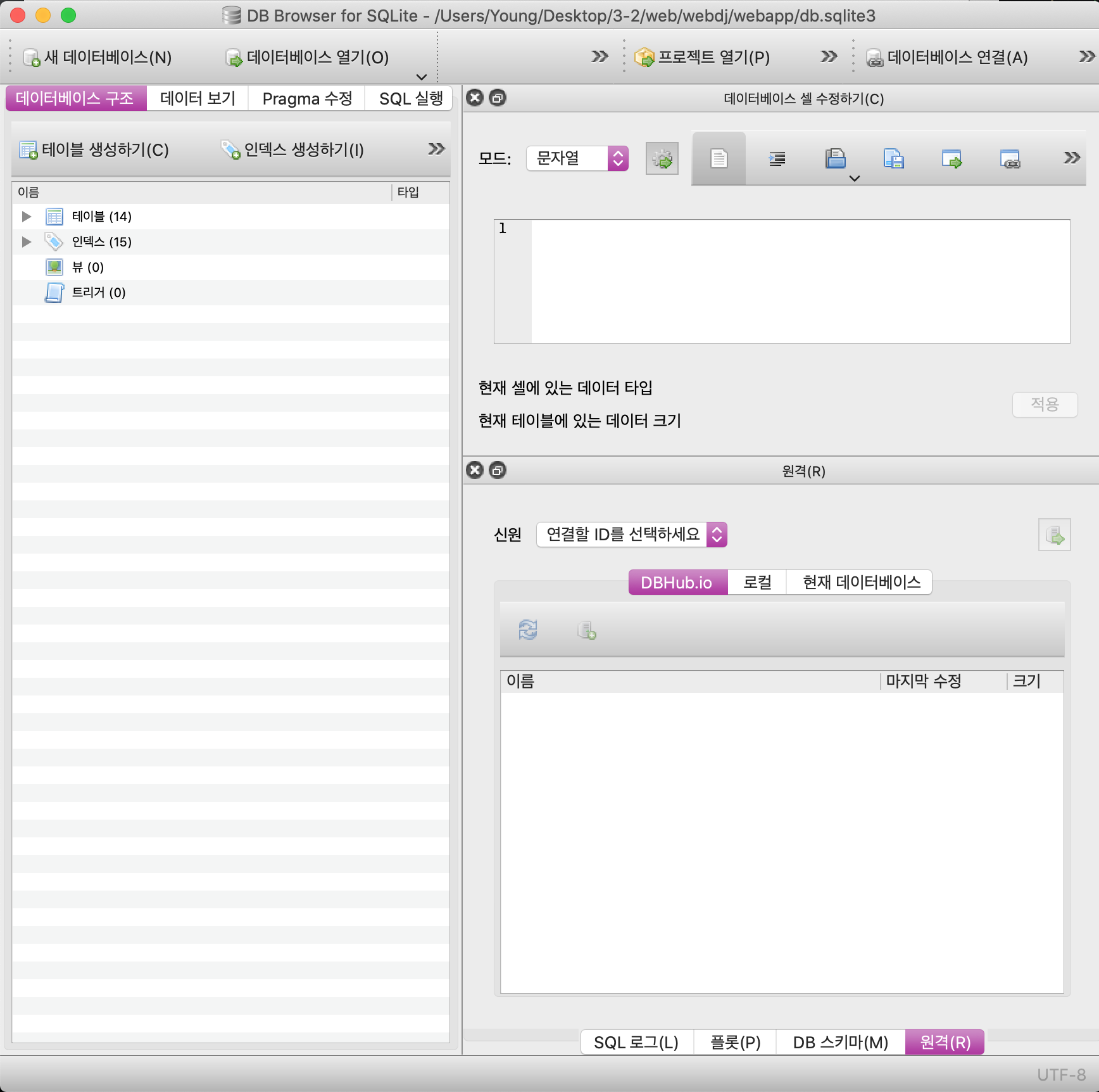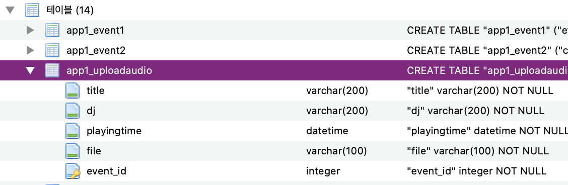 db.sqlite3 ํ์ผ์ ์ด๋ฉด ๋ค์๊ณผ ๊ฐ์ด ํ ์ด๋ธ, ์ธ๋ฑ์ค, ๋ทฐ, ํธ๋ฆฌ๊ฑฐ ํญ๋ชฉ์ ํ์ธํ ์ ์๋ค.