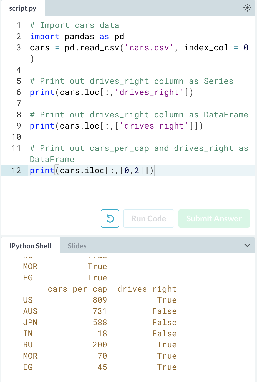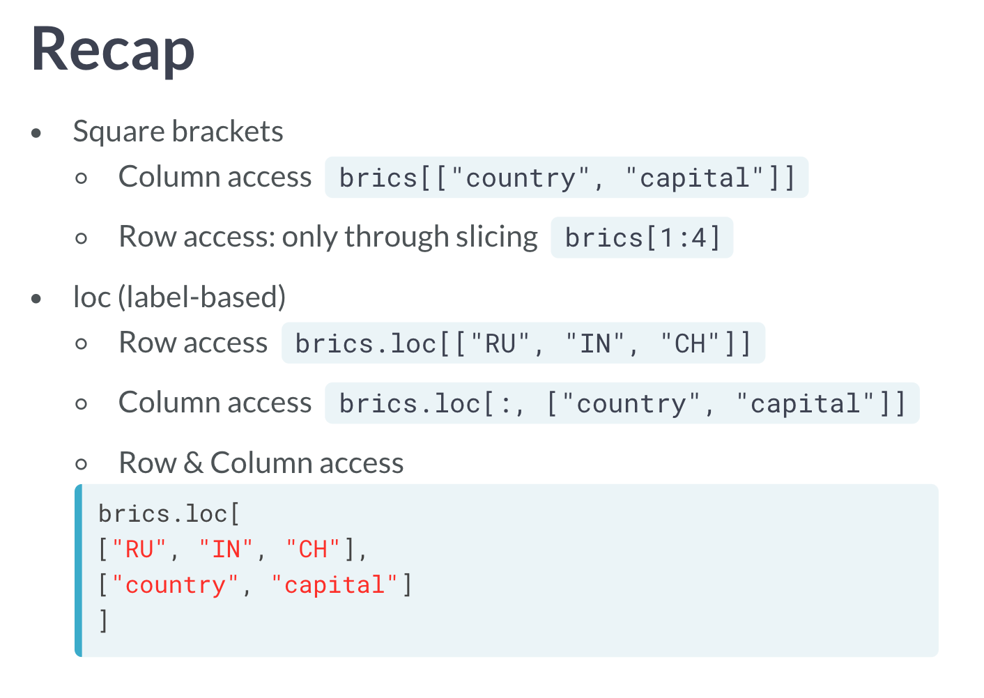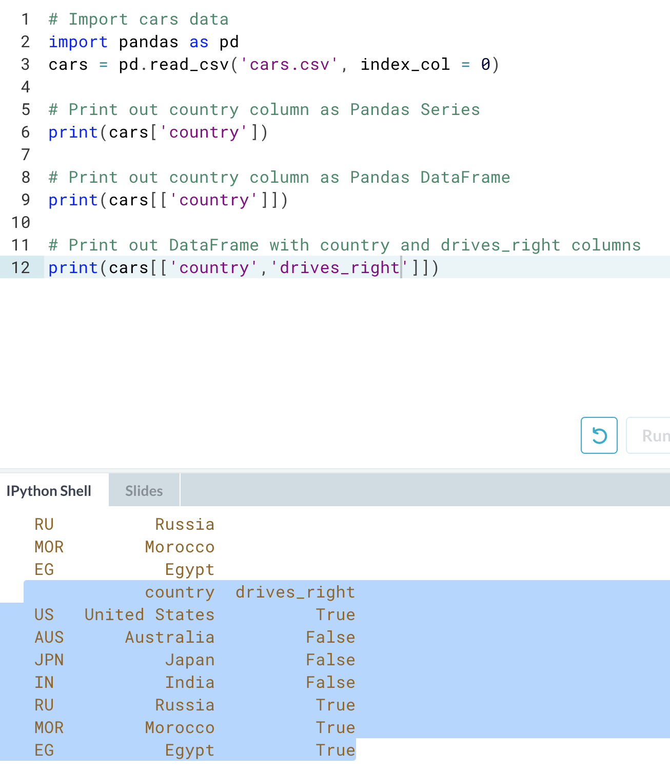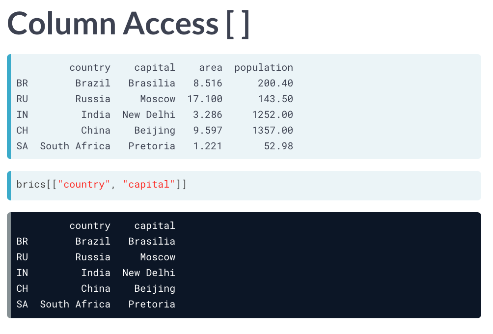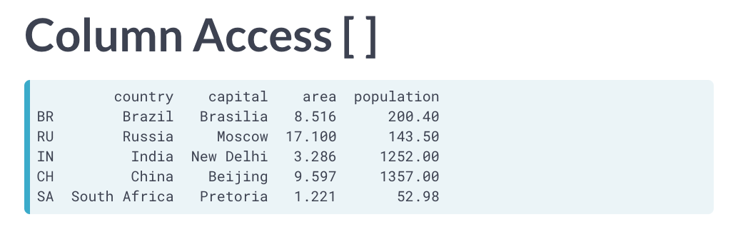 In the video, you saw that you can index and select Pandas DataFrames in many different ways. The simplest, but not the most powerful way, is to use square brackets.