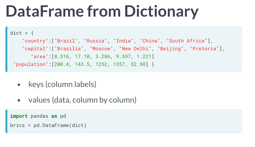 you can build it manually #1 : from dict using pd.DataFrame(dictname)