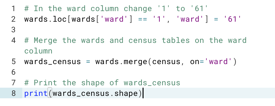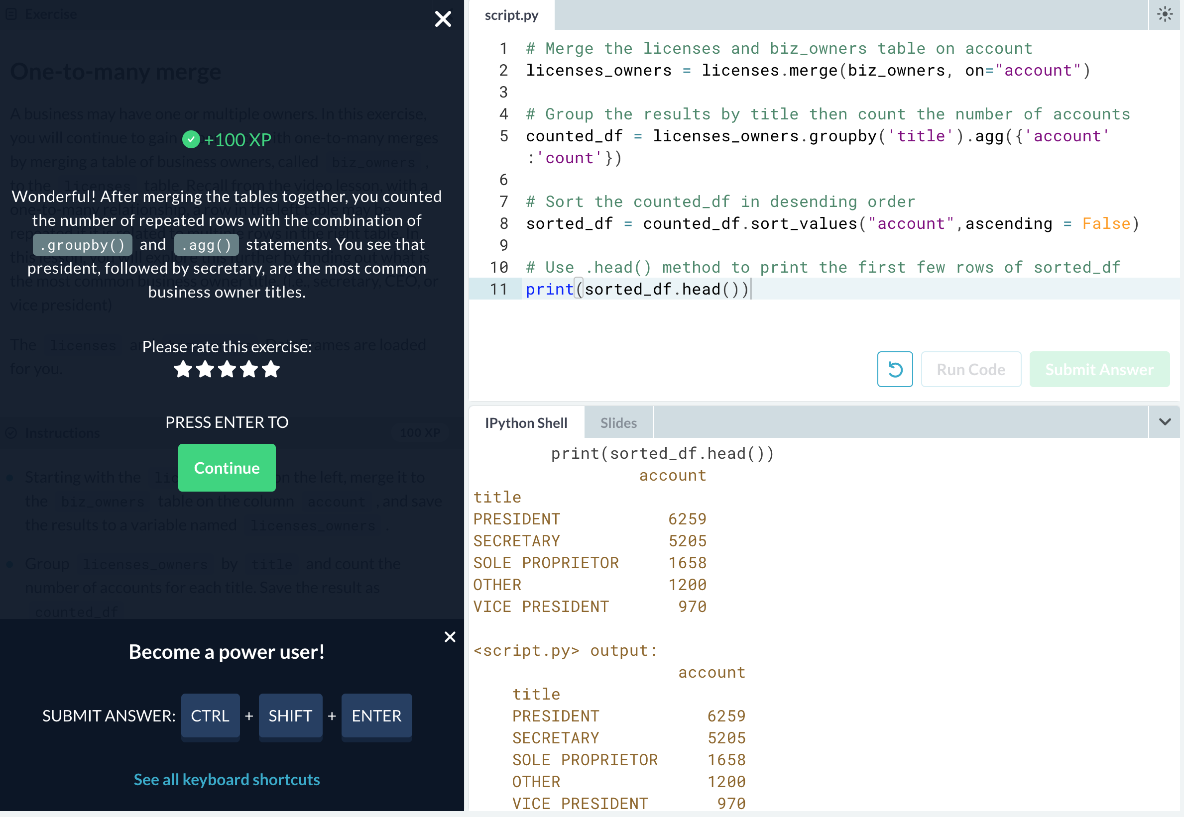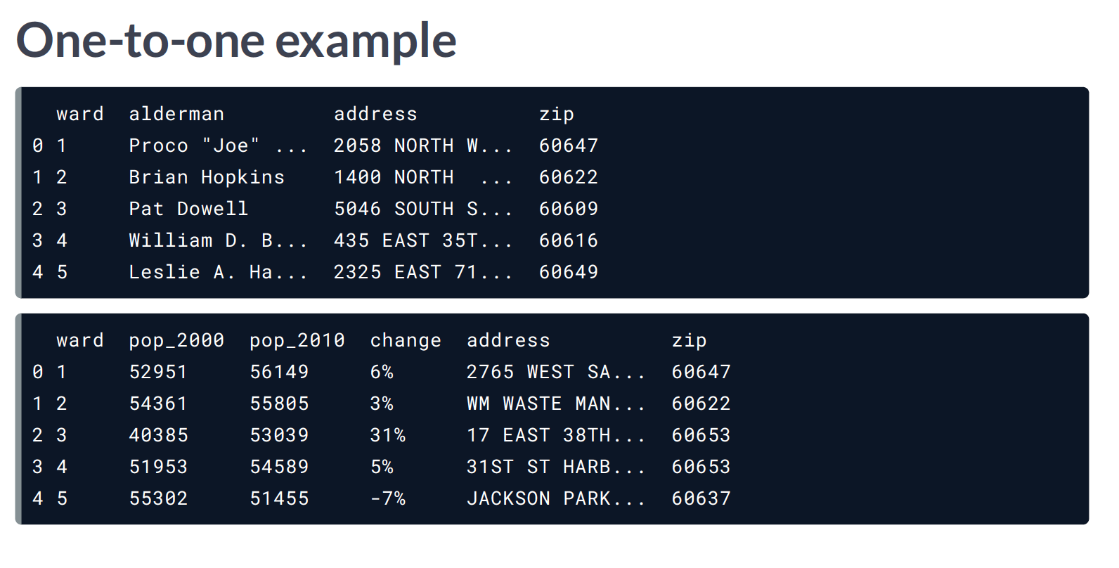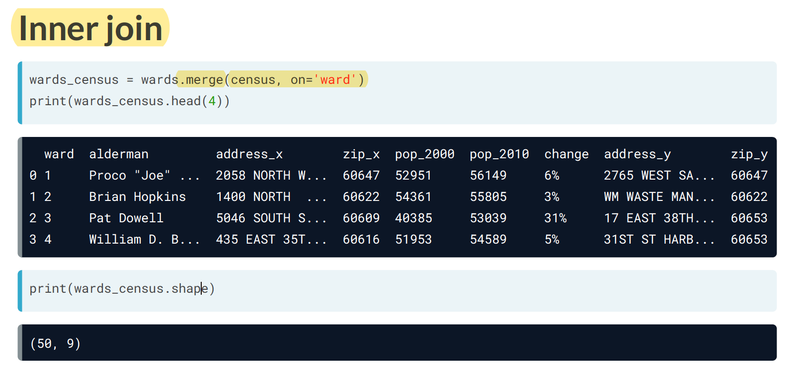 Great job putting your new skills into action. You merged multiple tables with varying relationships and added suffixes to make your column names clearer. Using your skills, you were able t