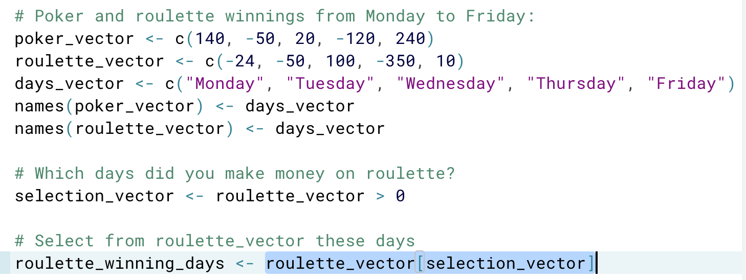 names(roulette_vector) <- c("Monday", "Tuesday", "Wednesday", "Thursday", "Friday")